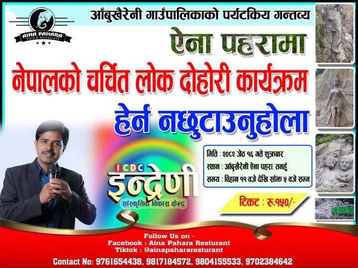 आँबुखैरेनी, १४ जेष्ठ । तनहुँको आँबुखैरेनी गाउँपालिका वडा नम्बर २ र ४ स्थित ऐना पहरामा आगामी जेष्ठ १६ गते शुक्रबार ‘इन्द्रेणी’नामक लोक दोहोरी कार्यक्रम आयोजना हुने भएको छ। सांस्कृतिक विकास केन्द्रद्वारा आयोजना गरिने उक्त कार्यक्रममा विभिन्न ख्याति प्राप्त राष्ट्रिय तथा स्थानीय कलाकारहरूले प्रस्तुती दिने छन्। कार्यक्रम बिहान ११ बजे देखि साँझ ५ बजे सम्म सञ्चालन हुनेछ।कार्यक्रममा सहभागिता जनाउनका लागि टिकटको मूल्य रु.१५० राखिएको छ।
