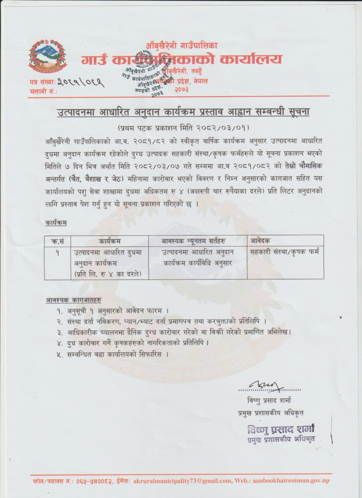 आँबुखैरेनी गाउँपालिकाको उत्पादनमा आधारित अनुदान कार्यक्रम प्रस्ताव आह्वान सम्बन्धि सूचना