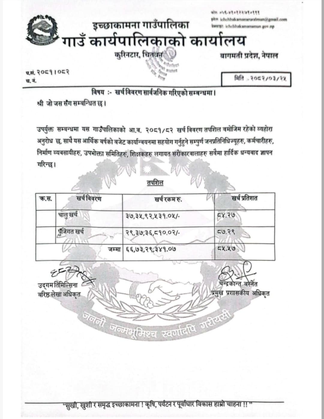 प्रमुख प्रशासकिय अधिकृत चन्द्रकान्त बस्नेतको प्रमाणीकरणमा खर्च विवरण सार्वजनिक गरिएको हो ।